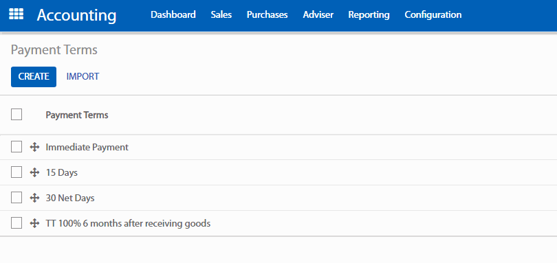 Để quản lý các khoản chiết khấu tiền mặt, chúng ta sử dụng khái niệm điều khoản thanh toán của phần mềm (từ phần mềm kế toán, chọn Configuration (Cấu hinh) > Management (Quản lý) > Payment terms (Điều khoản thanh toán) > Create (Tạo).