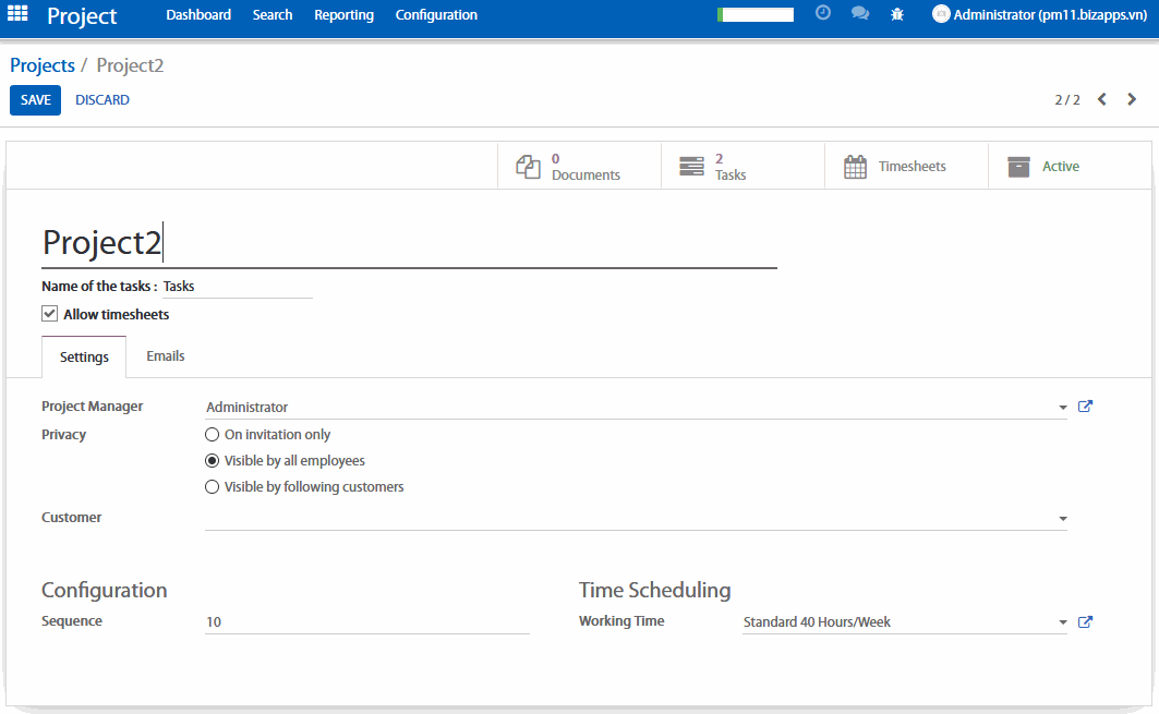 Customer Project (Dự án của khách hàng): khách hàng có thể nhìn thấy tiến độ dự án và các công việc trong cổng thông tin (portal) mà bạn cung cấp cho khách hàng nếu họ là người theo dõi dự án này.