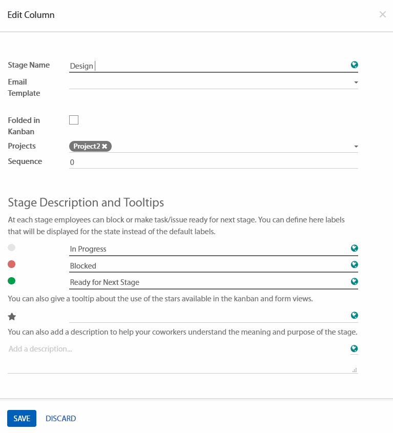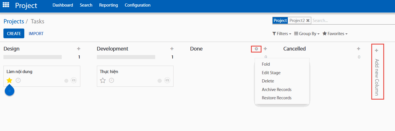 Bạn có thể dễ dàng tùy chỉnh giao diện nhằm phù hợp hơn với nhu cầu công việc của bạn bằng cách tạo ra các cột mới. Từ giao diện kanban của dự án, bạn có thể thêm mới một Giai đoạn bằng các click vào Add new column (Thêm mới một cột). Nếu bạn muốn sắp xếp lại thứ tự của các giai đoạn, bạn có thể dễ dàng làm việc đó bằng cách kéo và thả các cột bạn muốn di chuyển đến vị trí mong muốn. Bạn cũng có thể gấp hoặc mở ra các giai đoạn của bạn bằng cách sử dụng vào biểu tượng Settings (Cài đặt) trên giai đoạn mà bạn mong muốn