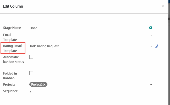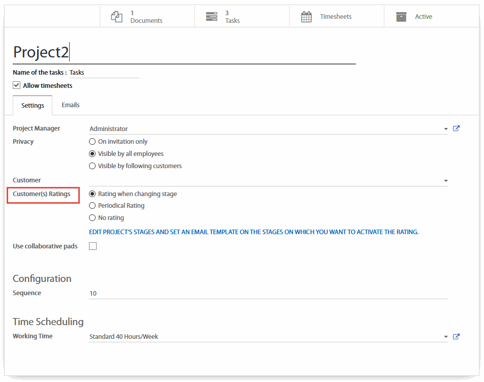 Đi đến menu Project (Dự án), trong phần thiết lập dự án bạn chọn tùy chọn Rating when changing stage (Đánh giá khi có sự thay đổi giai đoạn)