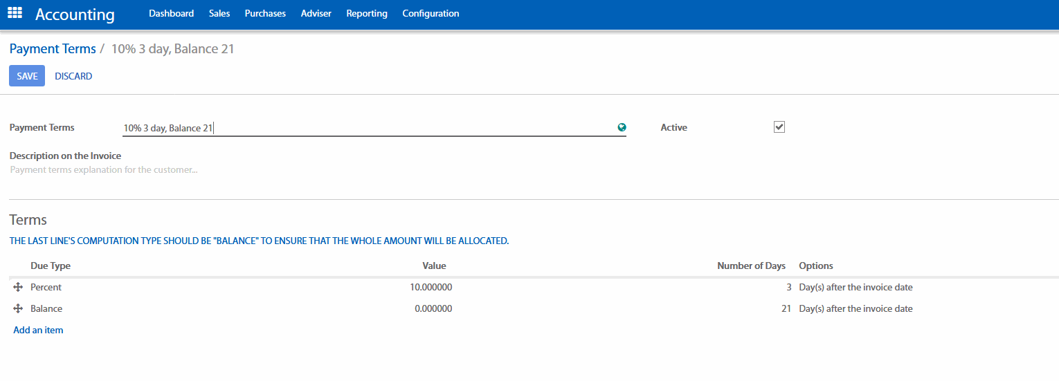Một điều khoản thanh toán thường có một dòng (ví dụ: 21 ngày) hoặc nhiều dòng (10 % trong vòng 3 ngày và thanh toán đầy đủ trong 21 ngày). Nếu bạn đặt điều khoản thanh toán gồm có nhiều dòng, hãy chắc chắn là dòng cuối cùng yêu cầu thanh toán đầy đủ ( để tránh trường hợp thanh toán 50% trong 10 ngày và 50% trong 21 ngày, bởi vì khi làm tròn, có thể không chính xác 100%).