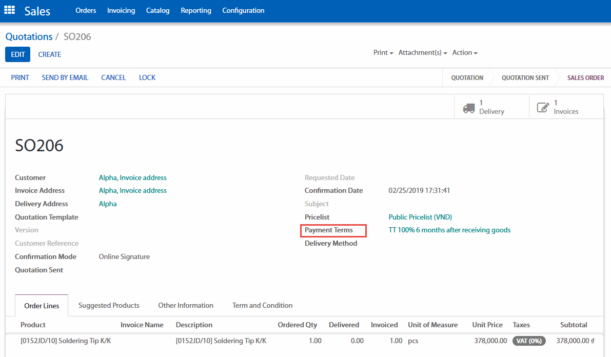 Bảng báo giá: các điều khoản thanh toán sẽ được áp dụng trên tất cả các hóa đơn và đơn đặt hàng theo bảng báo giá này, không áp dụng trên các bảng báo giá khác.